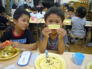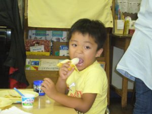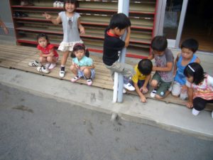写真では見えないですが、子どもたちが注目しているのは大量のアリです。みんなが登園してきた頃、アリの大移動が園庭で行われていました。アリさん、お引っ越ししたのかな?