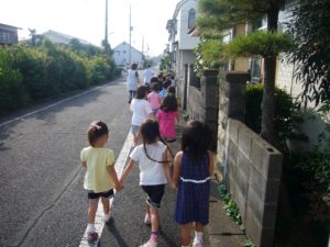 みんなで朝のお散歩。いつもと違う非日常に子どもたちは何を思ったのでしょうね。