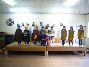 年長さんのクリスマスの聖誕劇は なかなか難しい言い回しが多いのですが、子どもたちの台詞を覚える早さと言ったら、本当に驚きます。
