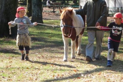 のぼる子ども多数。下にはスギのウッドチップ。