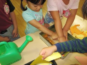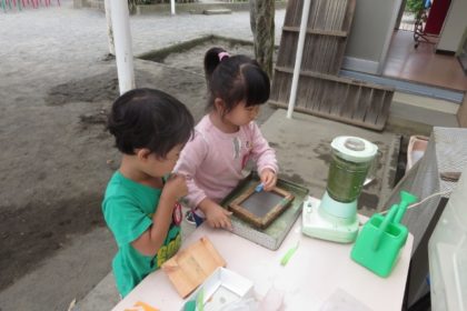雨の日は室内遊びを楽しむのですが、その中の一つに「紙すき」をしています。