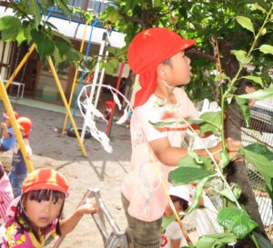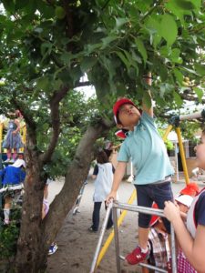幼稚園の園庭にある梅の木が今年は例年以上に数多くの大きな実を付けていました。そして先日、満を持して子どもたちと梅の実を取りました。取れるわ取れる、梅の実を脚立を使ったり、固定遊具から手を伸ばして取ったり……。