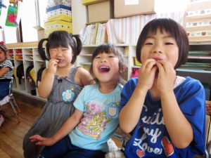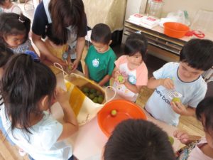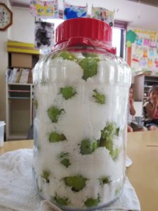 梅の収穫とともに年長さんが楽しみにしているのが、去年の年長さん達が砂糖につけていた梅を食べること。これが、おいしいのです!