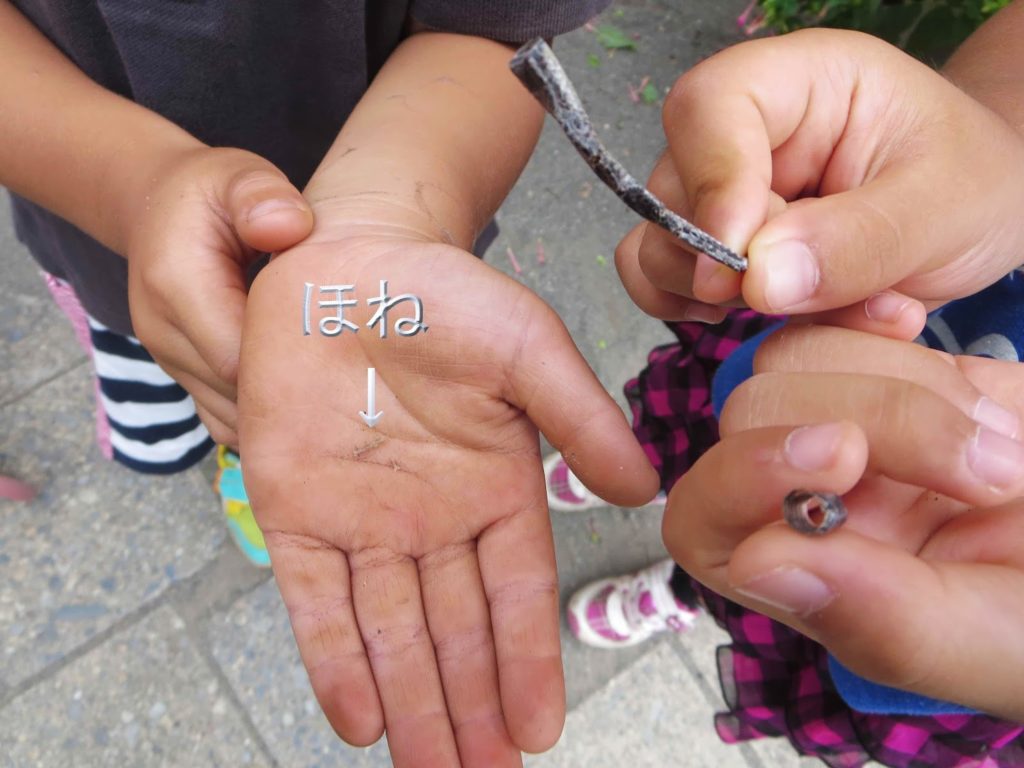 しっぽの肉は既になくなっていて、骨と皮の状態で園庭に落ちていたんですね。