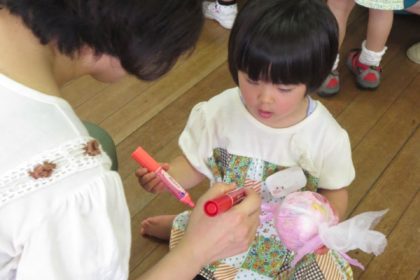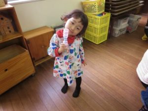 今日は「手作り楽器を作ろう」という事で、空の容器(ヨーグルトや乳酸飲料のものなど)を使ってマラカス(シェイカー?)を作りました。