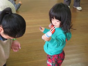 最後には「おもちゃのちゃちゃちゃ」を、作った楽器を使ってみんなで演奏し、歌いました。