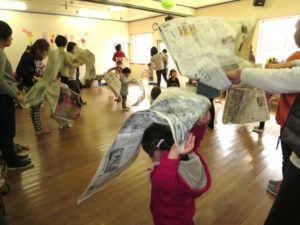 今日の遊びのテーマは「新聞紙」でしたが、そのねらいは五感(特に聴覚)を使った遊びということ。