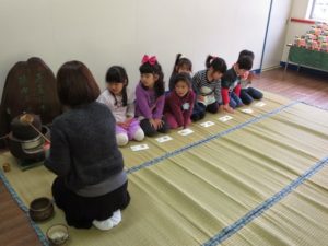 年長さんは年中さん、年少さん達とは違い、少人数ずつの本来のお茶会に近いものを行いたい、との思いから、子どもたちと先生のみで行います。