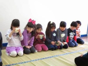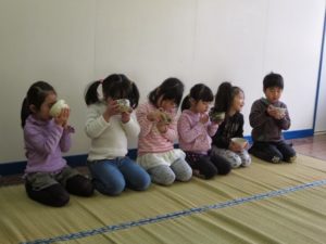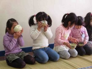 園長先生が「陶器で出来たお茶碗をよーく眺めて、楽しむ事もいいよね」と、言っていた言葉を思い出してか、本当にじっくりお茶碗を眺めている子がいました。すると、隣の子も「あ!そうか!」と思い出したのかじっくり眺め始めました。さらに、そのお隣の子も「!」とじっくり眺め始め、なんとも、その光景は可愛らしいものがありました。