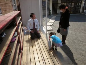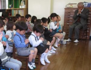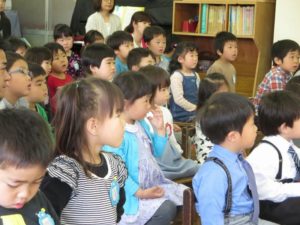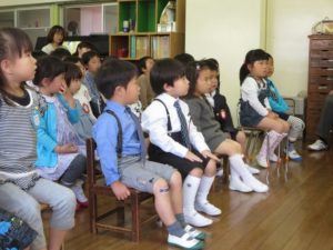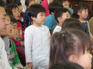 入園式では新しいお友達を加えて、行いました。泣く子はおろか、元気、元気、な印象でした。