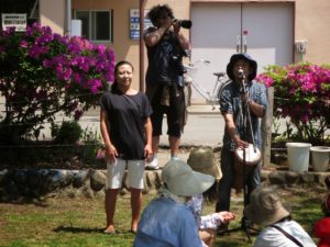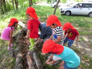 のぼる子ども多数。下にはスギのウッドチップ。