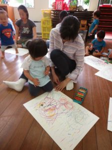 今日はクレヨンでくるくる、トントン、ザーザーお絵かき、ハサミでちょうちょを切って、のりではる活動をしました。