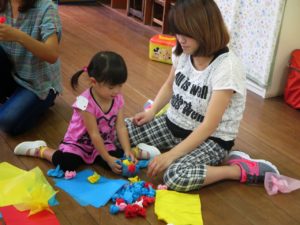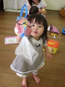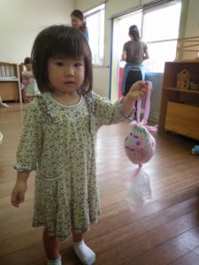 今日はてるてる坊主作り。子どもたちも幼稚園に慣れてきた様子で、自由に動いていました。
