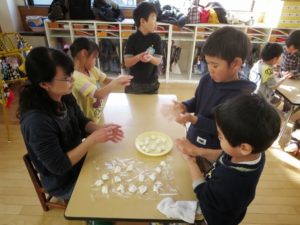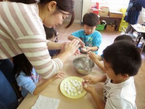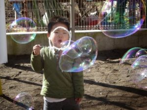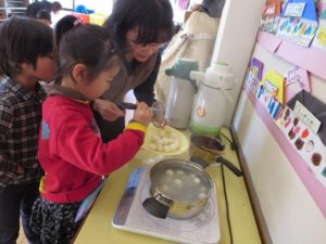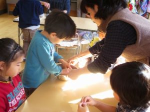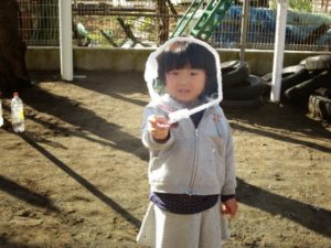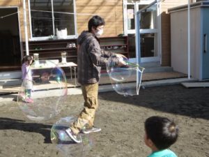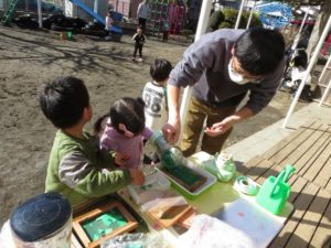 コーナー遊びはシャボン玉、紙すき、どろだんごをして遊びました。それぞれを少しずつ遊んで回る子、一つの遊びをずーっと行い、実験、研究をしているかのような子、いろいろでした。