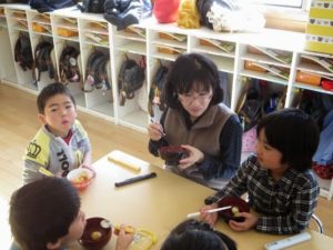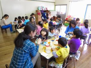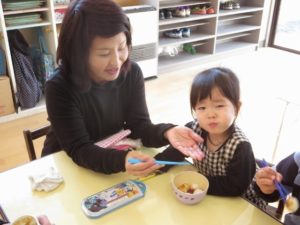 青梅幼稚園では保育参加があり、りす組(3歳児クラス)はコーナー遊びを、きりん組・ぱんだ組(ともに4 5歳児クラス)はクッキングを、保護者の方々と一緒に楽しみました。