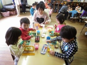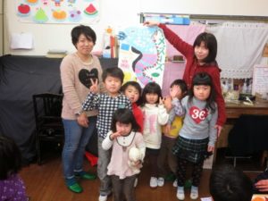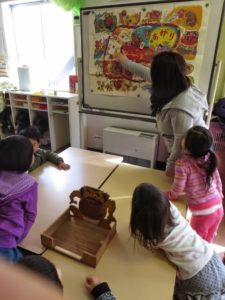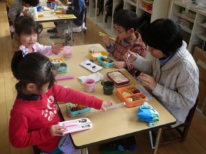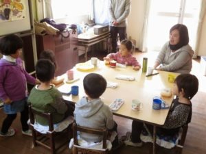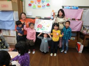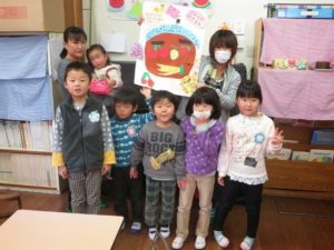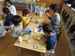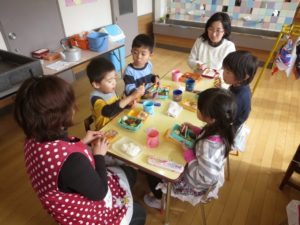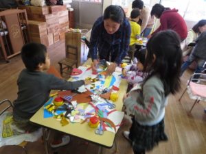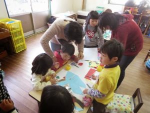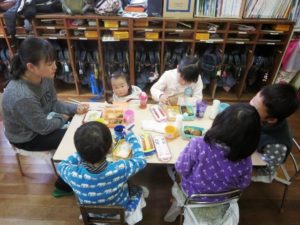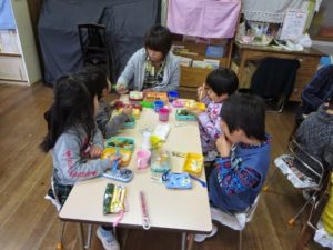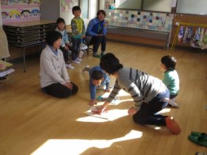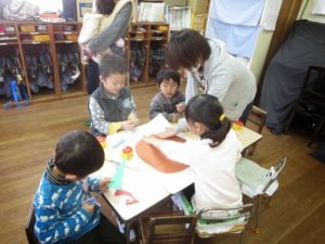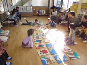りす組(3歳児クラス)は「ゲーム」、きりん組(4・5歳児クラス)は「グループ表制作」、ぱんだ組(4・5歳児クラス)は「大型かるた」をしました。