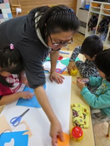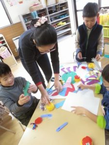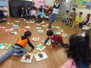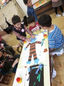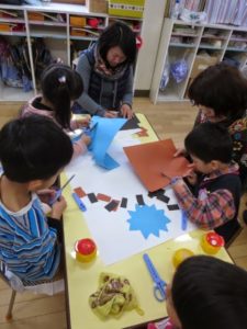 りす組(3歳児クラス)は毛糸を使った工作。きりん組(4、5歳児クラス)は大型かるた。ぱんだ組(4、5歳児クラス)はグループ表作りをしました。