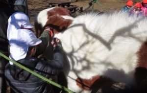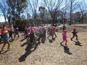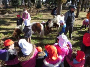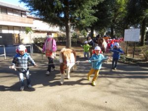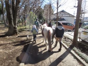 でも、今回は何と言っても年長さんメイン。「卒園、間近だしね」ということで、まずは公園内を引き馬でお散歩。冬とはいえ、食べることのできる草はそれなりに生えているので馬に引っ張られながらも、みんな大健闘!何とか自分の力で馬と一緒に歩くことができましいた。