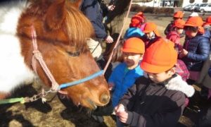 今年度二回目のポニーとの触れ合い。今回は元獣医さんのご父兄にもお手伝いいただき、前回よりもスムースに馬との距離感を適正に保つことができていました。少し近過ぎる子もいましたが、「いやぁ、上出来だよ」とポニーのおじさんも褒めてくださいました。