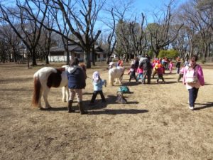 今日はスカッと晴れた気持ちの良い空の下、青梅幼稚園の子ども達はポニー二頭とともに若草公園へ行ってきました。