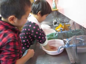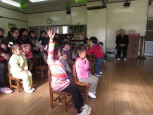 お当番のお仕事を年長さんが年中さんに一生懸命伝えています。
