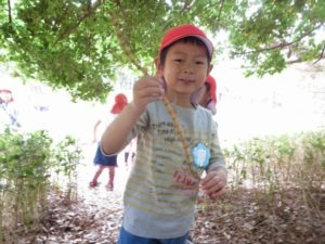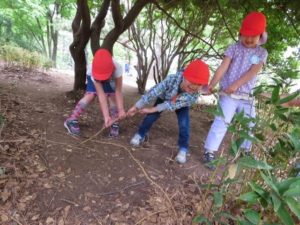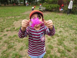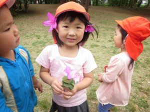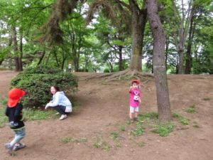 公園へついて、ほぼずーっと自由遊び。まずは走り回って鬼ごっこ。走り回ってる間に公園のいろんなところを見つけて、そのうち、それぞれの遊びに入っていきます。松ぼっくり、たんぽぽを探しだす子、木登りを始める子、だるまさんが転んだをする子、大人とのかかわりを求める子、それぞれの思いを木や草、花は優しく受け入れてくれている気がしました。