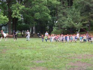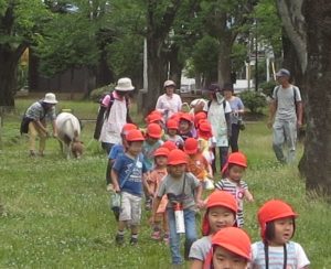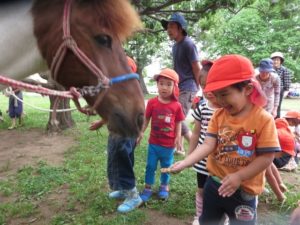 草の多いこの時期、ポニーと一緒にお散歩といっても簡単にはいきません。道草を食っては止まり、「行くよ!」と綱を引っ張る年長さんたち。真剣かつ楽しく時を過ごせていました。