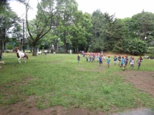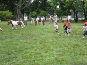 心配していた天気もなんとかもってくれて、今日はポニーと一緒に若草公園へ行きました。公園内には多くの親子連れ、他園のお友達が遊んでいて、その中でポニーと一緒にいったものですから、注目度は高かったと思います。