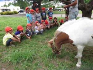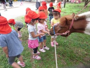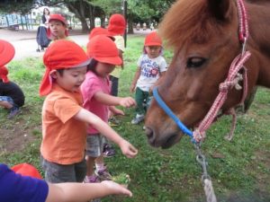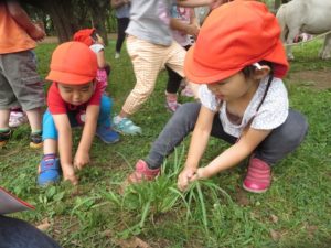まずはどんな草を好んで食べているか、どんなふうに食べているかをじっくり観察。そのあと、食べてくれそうな草を自分で探してきて、ポニーにあげました。年少さんの中には怖くてなかなかあげられない子もいました。けれど、他のお友達があげている様子を見ながら段々とその距離感をつかんでいたように思います。最終的には少しの草をあげることができていました。