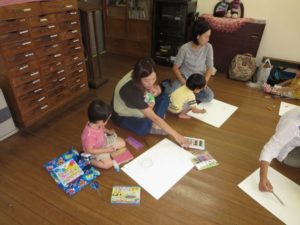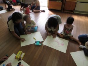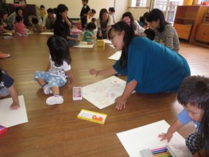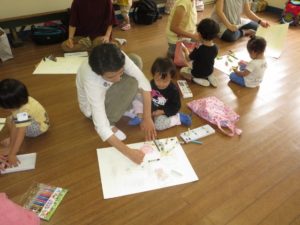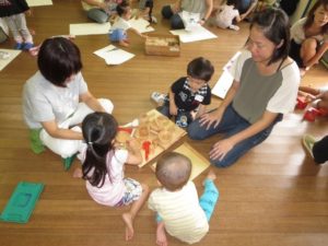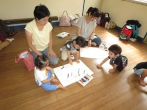 今日のテーマは「好きを探そう」ということで、お母さんたちを対象にしたテーマで行いました。親の子に対する影響力は絶大です。好きなことを探して発表し合っていると、なんだか聞いている方も幸せな気分になり、その気分はきっと子ども達にも伝わり、みんなが和やかになったのではないかな…と思いました。グループ毎の活動にしましたが、とても活発にお話がはずみ、自由遊びの時間もとても心地よく過ごすことができて、いつもより長く時間をとることができたようです。