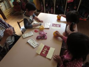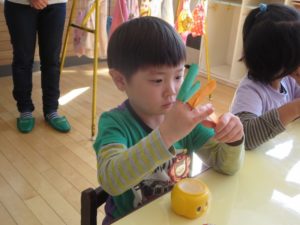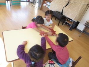 今日、朝の歌の時間に「どんな色が好き?」の問いかけに「○○くんと○○ちゃんと○○ちゃんと○○くんのお母さんの色が好き!」と応えた子がいました。友達のお母さんが好き、ということはそのお友達のことも大好きなわけで、なんだかとっても嬉しくなりました。