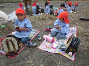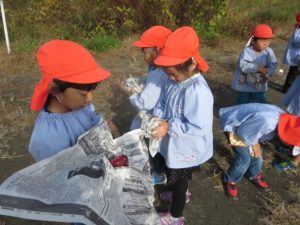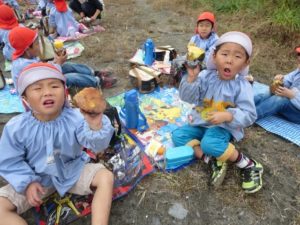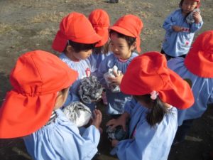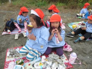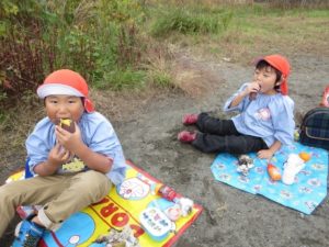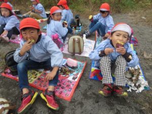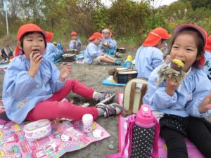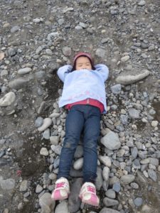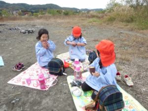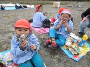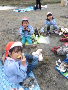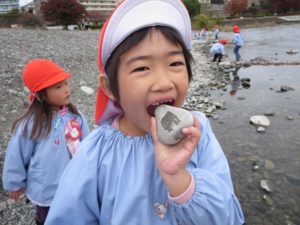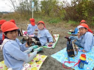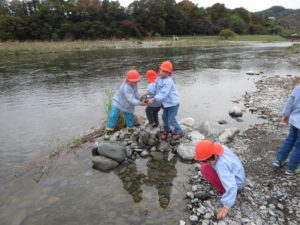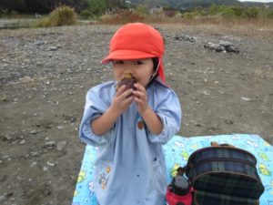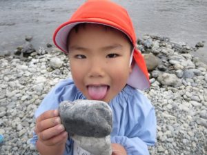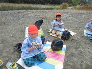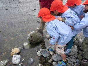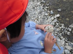 昼食後の自由遊びも河原で石を積んでみたり、年度を掘り当ててみたり、魚(川の中の生き物)を捕まえよう捕まえようとしたり、あっという間に時間が経ってしまいました。
