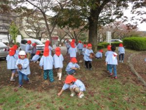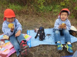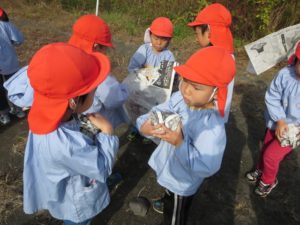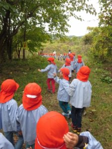 道のような道でないようなところを歩いていくと…「あの…ちょっと怖いんですけど…」という子もいましたが、でも「探検隊だ!」といろんな木の実を見つけたり、大きなクモに驚いたり、ススキを手に勇ましく進んでいく子どもたち。その表情は実に生き生きとしたものがありました。