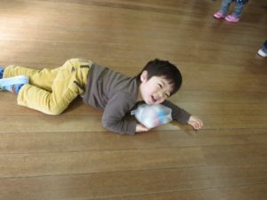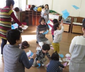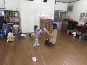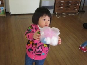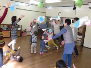 リトミックで体を動かし、スティックを使って遊び、ティッシュやさくら紙を使って遊びました。