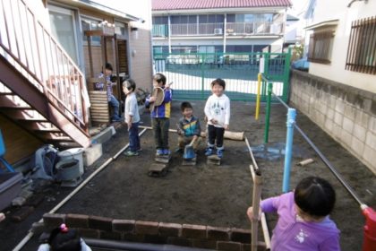 のぼる子ども多数。下にはスギのウッドチップ。