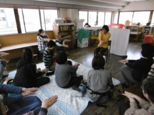 素話あり、絵本の読み聞かせあり、手あそびあり。