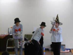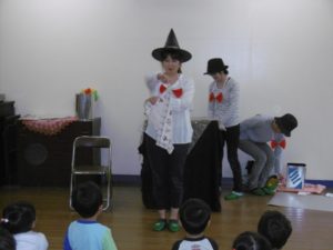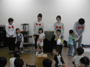 「どの手品がびっくりした?」と終わってから子どもたちに聞くと、「ペットボトルの水の色が変わる手品!」との声が多かったです。お誕生者たちは自分のお母さんがみんなの前に出てだし物をやっていることに、はにかみながらも、嬉しさを感じていたようです。誕生会の後はその子たちから、いつも以上に覇気を感じました。