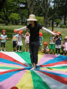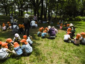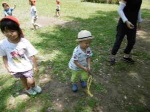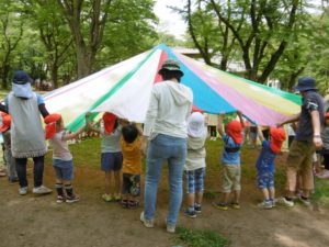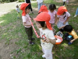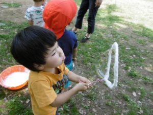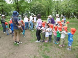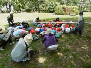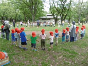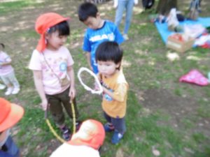 今日は若草公園で未就園児クラスのつくし組と青梅幼稚園在園児との交流をテーマに一緒に楽しい時間を過ごしました。歌やじゃんけん列車、パラバルーン、猛獣狩り、ゴムひもでの遊び等をして一緒に遊び、その後、草花で冠やネックレス、ブレスレットを作ったり、シャボン玉遊びをしてそれぞれが自由な時間を過ごしました。