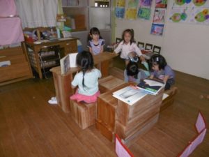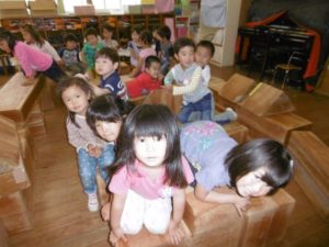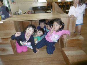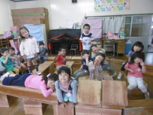 その間、年中さんは大型積み木で遊びました。いろんなグループが混ざり合って、いろいろ楽しく遊べたようです。近々、「いやいやえん」の“くじらとり”でも読もうかな、なんて思いました。
