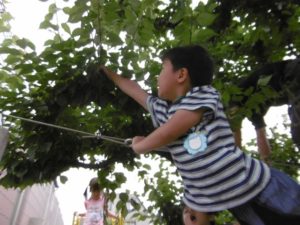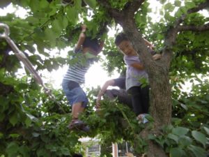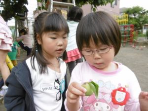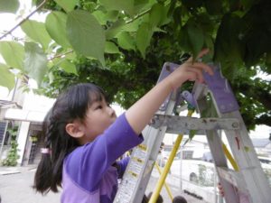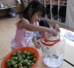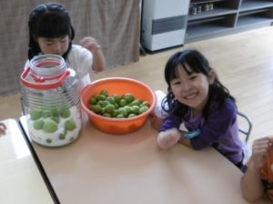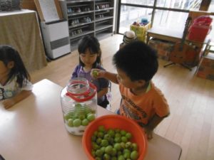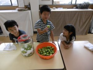 毎年、鈴なりに実る梅の実を、子どもたちとこれでもか、というくらいに取るのですが、今年はそんなに多くはありませんでした。しかし、それだけに、梅の実を見つけた時は「あった!」「見つけた!」と本当にうれしそうな声。で、今年の収穫はきっちり3kg。年長さんが作るにはちょうどいい量でした。