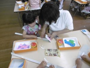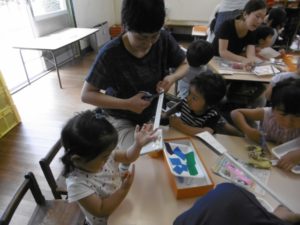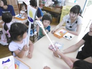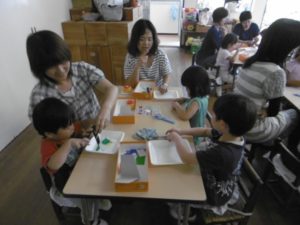 保育内容は今日もプレイルーム。作る部屋、ゲームの部屋を自由に選んで参加しました。作る部屋はギター作り、ゲームの部屋はつながり遊びや腹話術などを楽しみました。