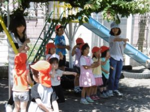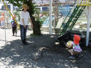 日差しにあたると、ジリジリ肌に焼け付く感じがありました。乳幼児期の紫外線照射については様々な報告がなされておりますので、十分配慮していきたいと思います。しかし、それと同時に外で遊ぶ解放感、楽しさも子供の成長には欠かせないものですので、両面に十分気を配りながら、充実した日々を楽しんでいきたいと思います。