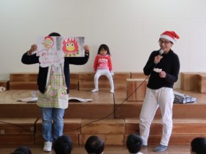 なぞなぞは子どもたち、大好きです。力いっぱいの声を振り絞って答えを言っていました。