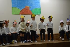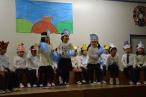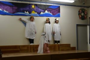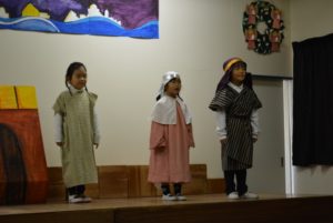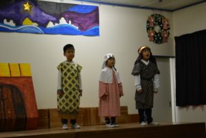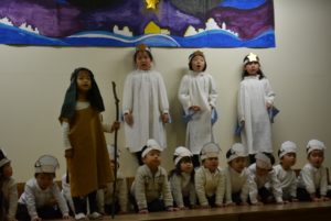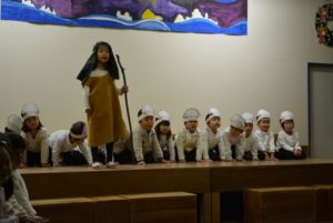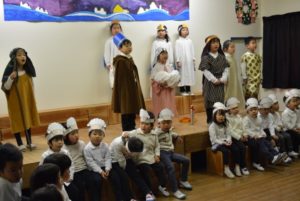 年長さんは全園児とともにする聖誕劇(ページェント)。今年は9人と人数は少なかったのですが、それぞれの個性が際立って、この年長さんたちならではのページェントになったのではないでしょうか。夫婦げんかの絶えないヨセフさんとマリアさん。乗り越えなければならない事、自分との葛藤などあるだろうに…そんな人の心配をよそに、台詞を最初の練習からすんなり言えていた天使さん達。練習では身振り手振りが大きかったのに本番は棒立ちだった誇り高き宿屋さんたち。天使の出現に糸の切れた凧のように驚き、それでも羊たちを導く孤高の小さい羊飼いさん。きれいな歌声を持ち、一人で三つの宝物を持って行った占星術の博士さん。