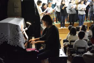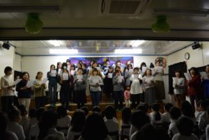 子ども達の次はお母さんたちによる讃美歌「きよしこのよる」。ソプラノ アルトの2部に分かれて綺麗なハーモニーが響きました。お互いを聴き合うからこそのハーモニー。本当に素敵でした。それが証拠に歌が始まるまで、ざわざわしていた子供たちがピタっと聴き入っていましたものね。