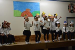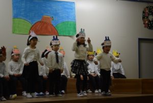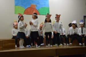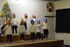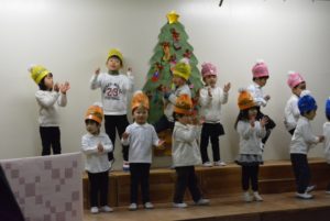 クリスマスの礼拝をみんなで守った後は各学年でのだしものです。年少さんはかわいらしい踊りと歌を披露してくれました。その中でエピソードを一つ。いつもは先生よりもしっかり踊ると評判のある女の子。あれ?今日はいつもと違うなぁ…と見ていたら、なんと片方の手にキラキラ光るスパンコールを握りしめていました。なんでも出番直前に落ちていたのを拾ったらしく、大事に大事に握りしめていたのです。普段から小さいものを集めるのが好きなようで、今日だって例外ではありません。彼女にとっては大事な宝物。「なぁーんだ。そうだったんだぁ(笑)」と周りの反応も温かいものでした。