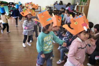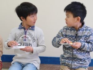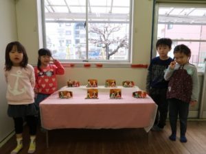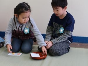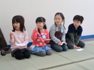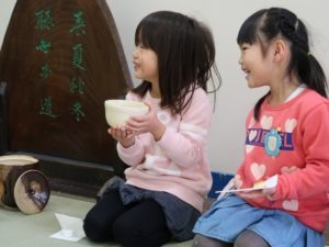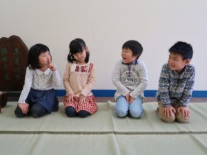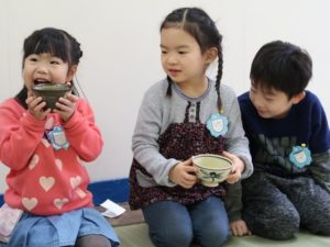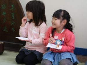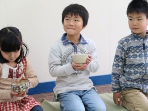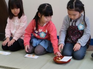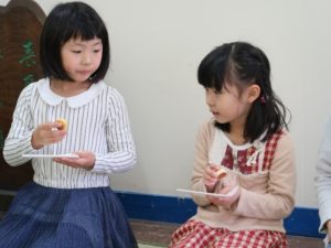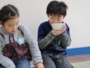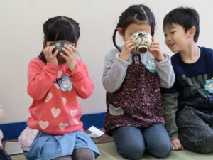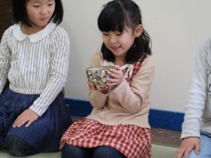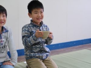 今日は年長さんのお茶会がありました。年長さんは子ども達だけで静かな時間を過ごしました。お菓子を食べた時、お茶を飲んだ時、決して騒いだりすることはなく、けれど体全体で喜んでいる様子がありました。静かな中だからこそ、隣の友達が何を感じているかがわかりやすいのかもしれません。自分以外の他者への意識がとても高かったように見えました。