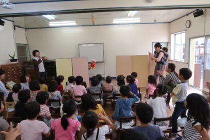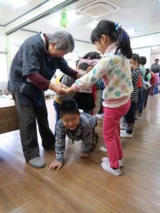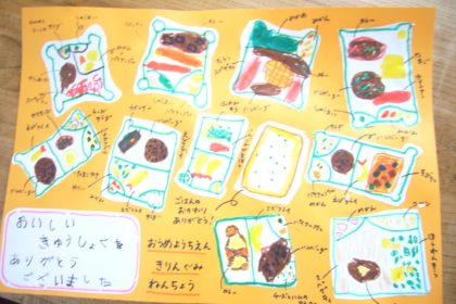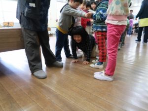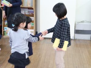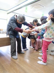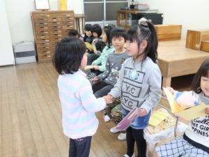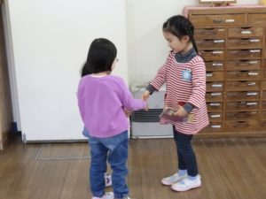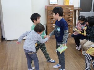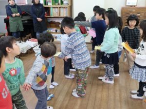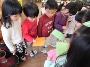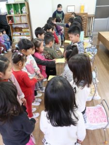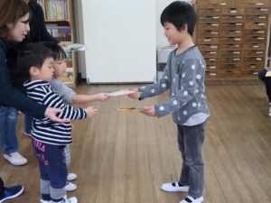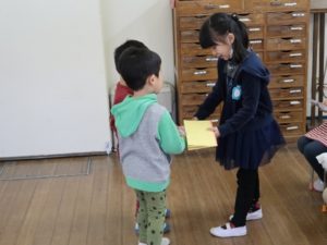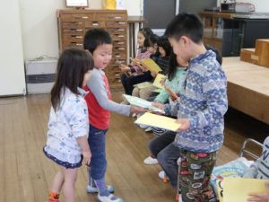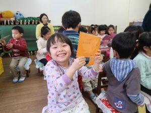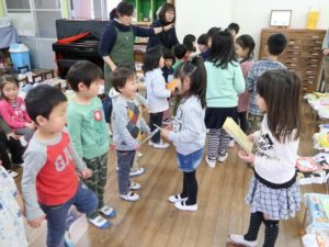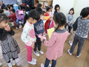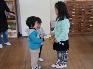 いよいよ卒園式を木曜日に控え、今日はみんなで年長さんとお別れ会を持ちました。「年長さん大好き」という子どもたちの気持ちが伝わってきました。年長さんたちもとても喜んでいて「これは大切にしないとな」と、年少さん、年中さんからもらったカードを大事そうに抱えていました。