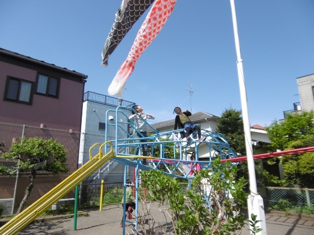 のぼる子ども多数。下にはスギのウッドチップ。