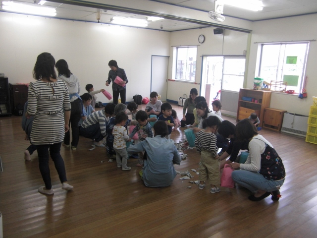 さて、第2回目のつくし組は新聞紙をびりびり破いて、袋に詰めて「おさかなさん」を作りました。